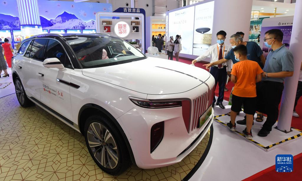 在海南举办的第二届中国国际消费品博览会上,国货精品馆达5000平方米,有1200多个国内品牌亮相。一些国货品牌开辟差异化“新赛道”,融合功能与审美,通过科技赋能升级产品,展示了“中国制造”到“中国智造”的转变。图为7月29日,观众在消博会上参观红旗纯电SUV。