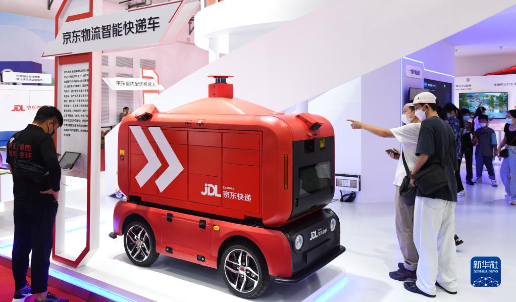 在海南举办的第二届中国国际消费品博览会上,国货精品馆达5000平方米,有1200多个国内品牌亮相。一些国货品牌开辟差异化“新赛道”,融合功能与审美,通过科技赋能升级产品,展示了“中国制造”到“中国智造”的转变。图为7月29日,观众在消博会上参观京东物流智能快递车。