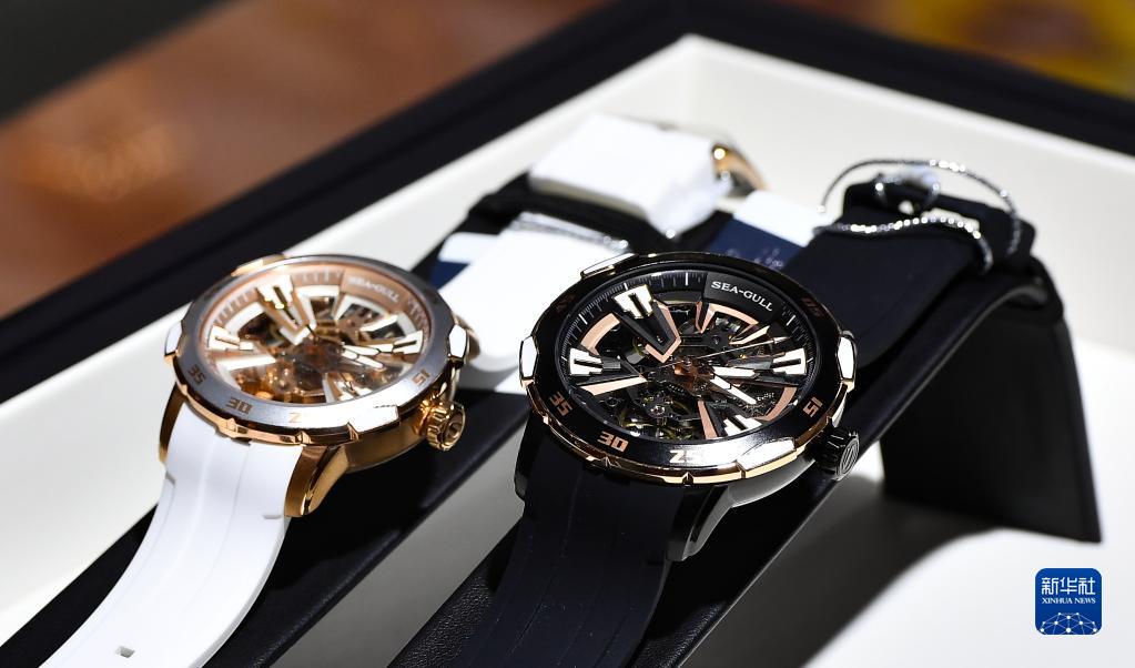 在海南举办的第二届中国国际消费品博览会上,国货精品馆达5000平方米,有1200多个国内品牌亮相。一些国货品牌开辟差异化“新赛道”,融合功能与审美,通过科技赋能升级产品,展示了“中国制造”到“中国智造”的转变。这是消博会上展出的海鸥手表(7月26日摄)。