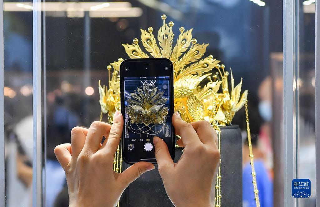 在海南举办的第二届中国国际消费品博览会上,国货精品馆达5000平方米,有1200多个国内品牌亮相。一些国货品牌开辟差异化“新赛道”,融合功能与审美,通过科技赋能升级产品,展示了“中国制造”到“中国智造”的转变。图为7月29日,观众在消博会上拍摄老凤祥展出的“凤舞九天·金凤冠”。