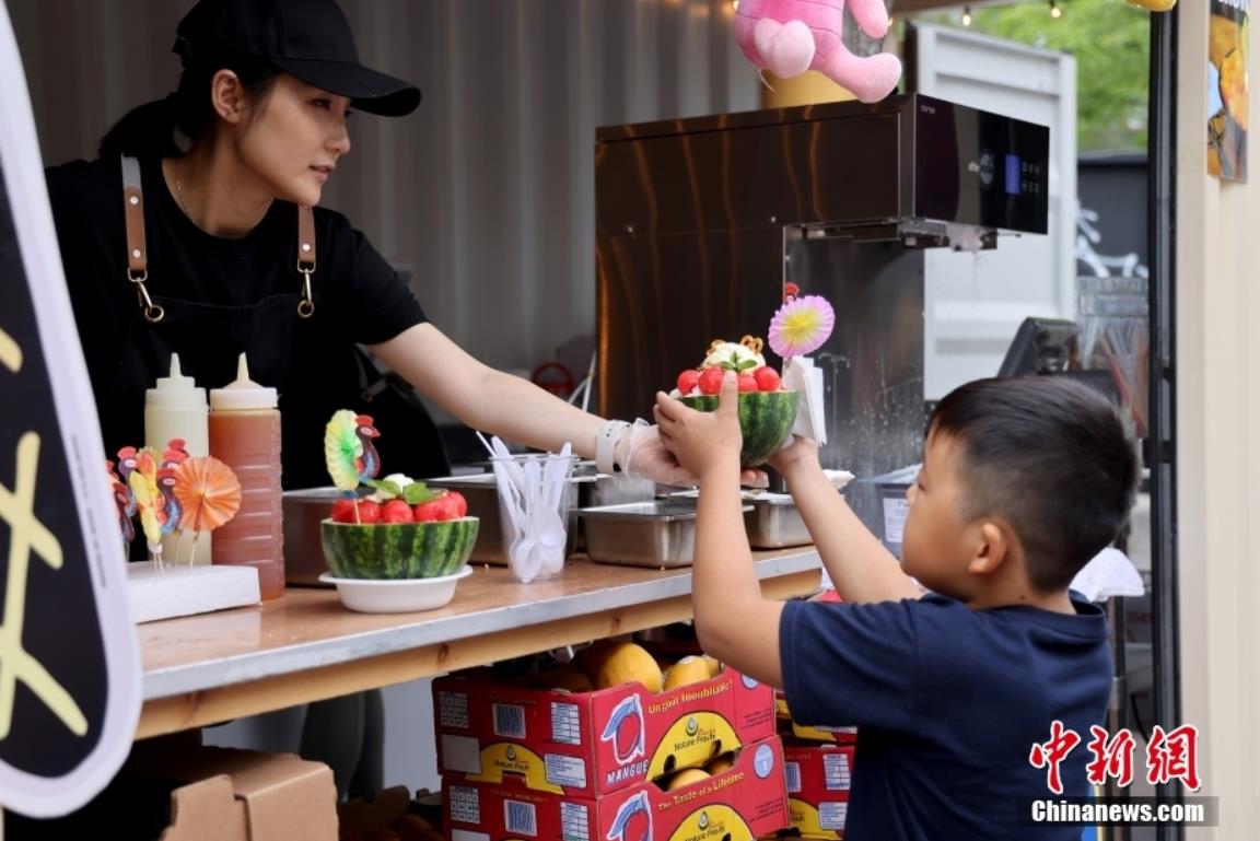 当地时间7月30日,加拿大蒙特利尔唐人街举行亚洲美食集市。这一融合多种亚洲美食的集市将持续至10月2日。吸引许多顾客参观光顾。图为美食集市上小朋友购买美食。