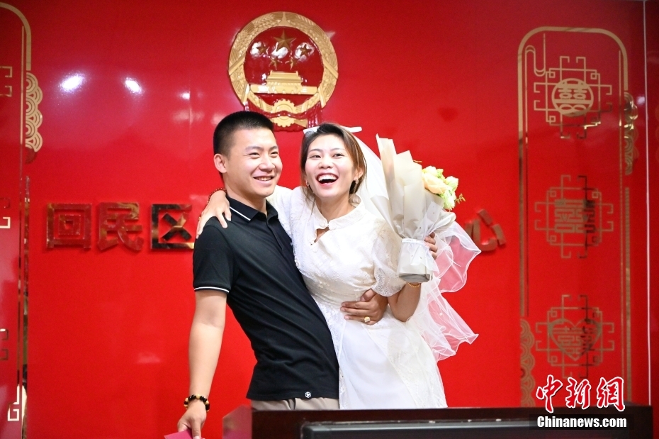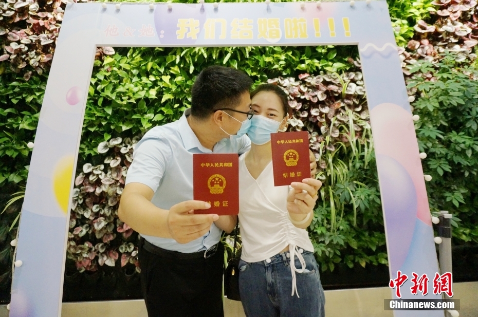 8月4日是一年一度的中国民间传统节日“七夕”。近日,随着这一传统节日的到来,中国各地甜蜜“升温”,人们通过多种形式的活动表达爱意,一幕幕浪漫场景轮番上演。图为8月4日,内蒙古自治区呼和浩特市回民区民政局婚姻登记处,一对新人在办理结婚登记后拍照留念。中新网