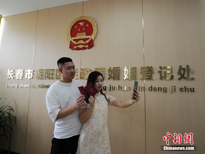8月4日,吉林省长春市许多准新人选择这一天去办理登记结婚。图为新人展示结婚证。 中新网