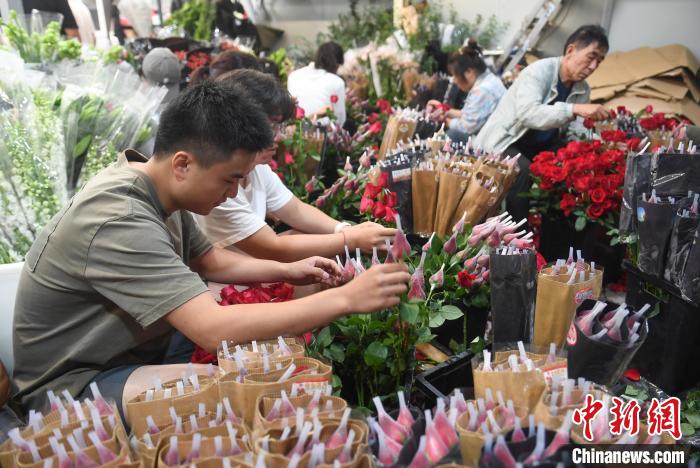 近日,在传统“七夕”情人节即将到来之际,浙江杭州鲜花批发市场、鲜花店的玫瑰等鲜花迎来销售高峰,“浪漫经济”在节前升温。图为鲜花批发市场的商户工作人员在包装玫瑰花。中新网