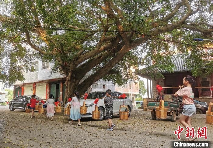 “七夕”也是广西南宁市邕宁区蒲庙镇孟莲村那莲街的赛巧节,当地家家户户制作传统美食和手工艺品进行赛巧。从8月3日开始,那莲街群众就开始制作美食和各种手工艺品,通过家庭小聚承传习俗,为“七夕”节营造浓浓的仪式感。那莲“赛巧节”至今已有二百多年历史,被纳入广西壮族自治区级非物质文化遗产代表性项目名录。图为孩童们在大人带领下,到莲江边挑“七夕”水。这个古老的仪式寄托了人们吉祥安康的美好憧憬。 中新网