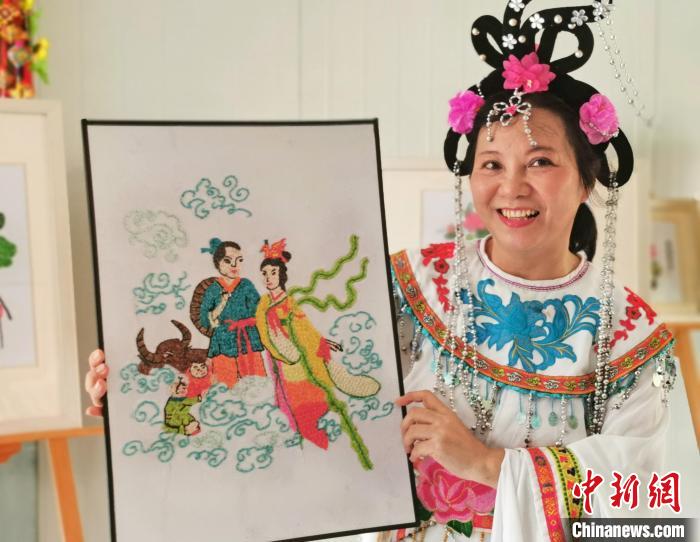 一名村民展示点米画作品《牛郎织女》。中新网