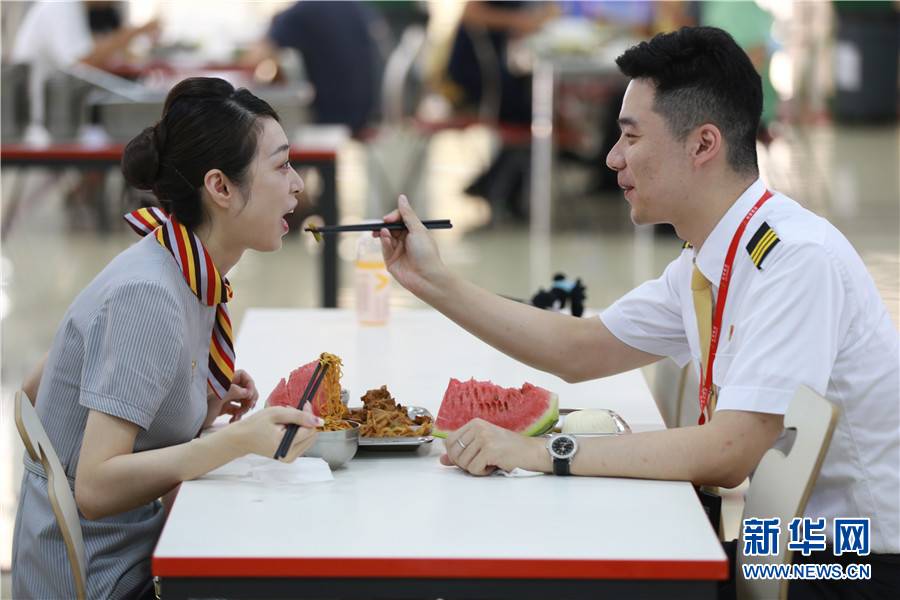 王栋是长安航空的一名飞行员,他与同为一家公司的空乘妻子王铠佳在万米高空邂逅。书写了一段民航“夫妻档”的佳话。 8月4日正值中国传统佳节——七夕节。对于相爱的人来说,这是团聚享受甜蜜的日子,但对那些坚守在民航一线的员工,特别是“双飞家庭”来说,节日或许只是一个普通的工作日,他们将过节的喜悦藏于心底,履行“云端摆渡人”的职业责任,用扎根岗位的坚守谱写万米高空中的别样浪漫。图为王铠佳与王栋夫妻二人在单位食堂吃饭。新华网