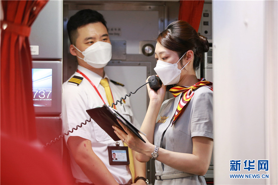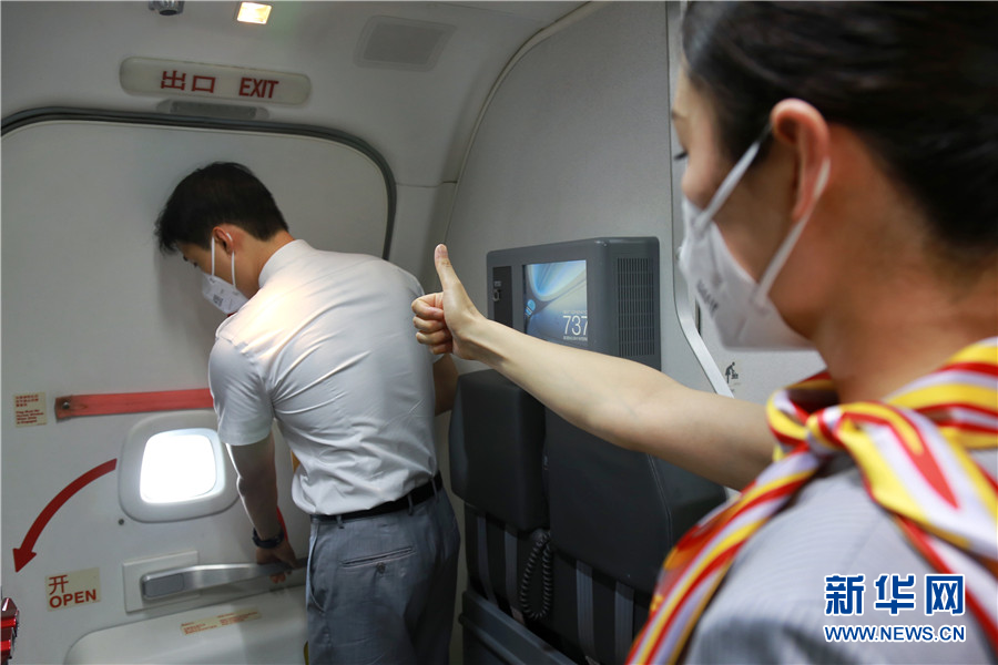 李豆豆和乔玲子是长安航空两名“90后”乘务员,2020年领证结婚的他们自此加入了民航“双飞家庭”的队伍。二人大学时期便相识相恋,后又因爱情来到同一家公司干着同一种工作。从校服到工作服又到婚纱。二人成为了许多人向往的“爱情范本”。图为李豆豆(左)和乔玲子二人配合打开飞机后门。新华网