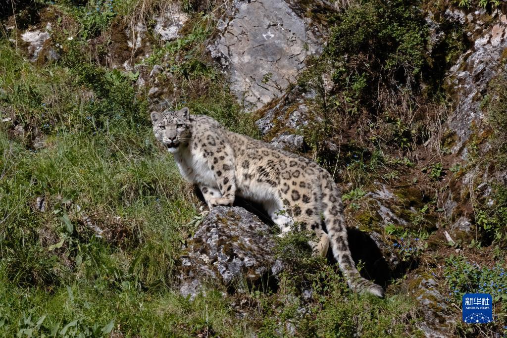长期观察研究显示,峡谷内至少已记录到84只雪豹个体以及12只金钱豹个体,此外,还分布有藏棕熊、狼、猞猁等食肉动物。图为在昂赛大峡谷内拍摄的雪豹(8月6日摄)。新华网