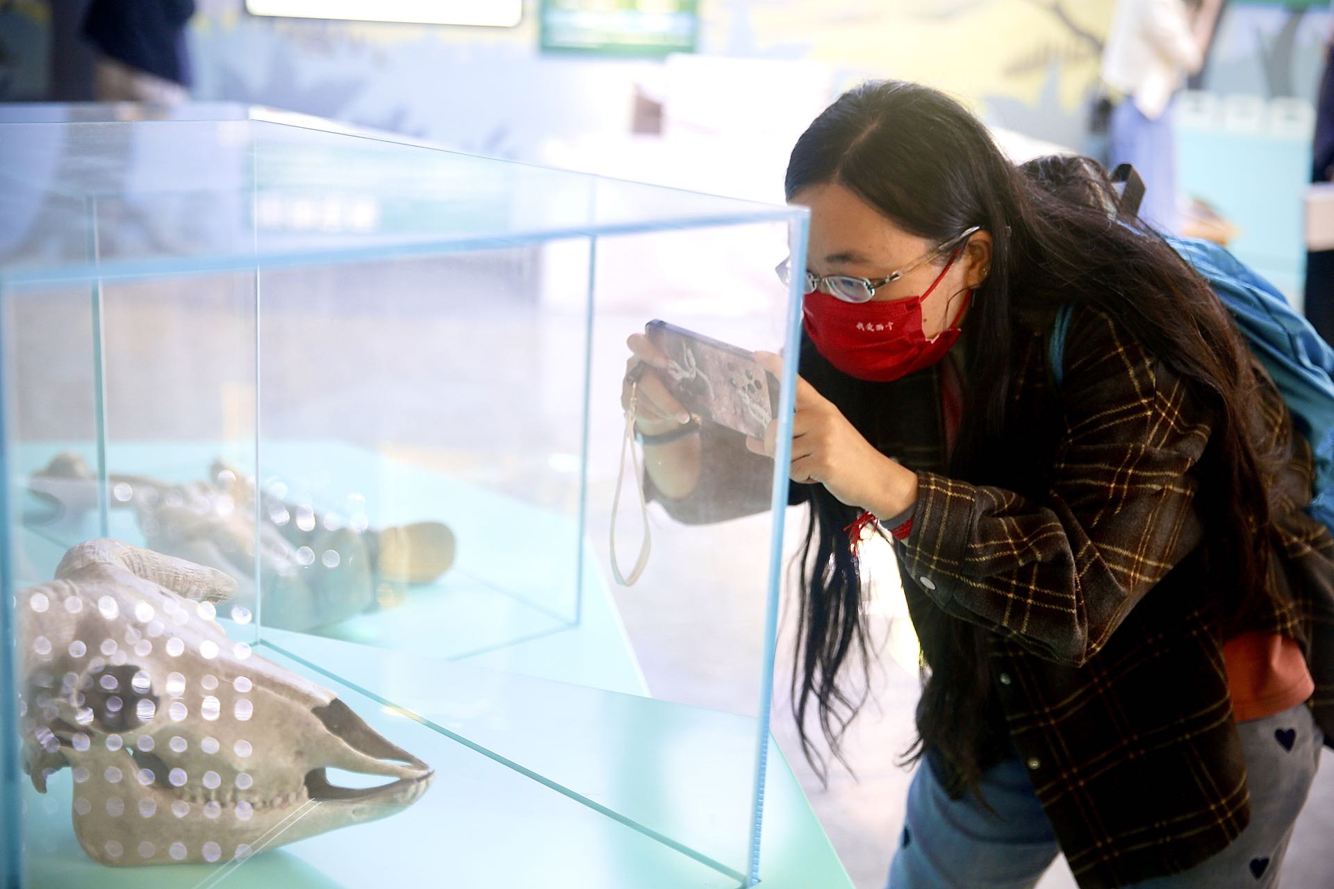 8月7日,参观者拍摄岩羊头骨。南美侨报网特约记者陈慧摄