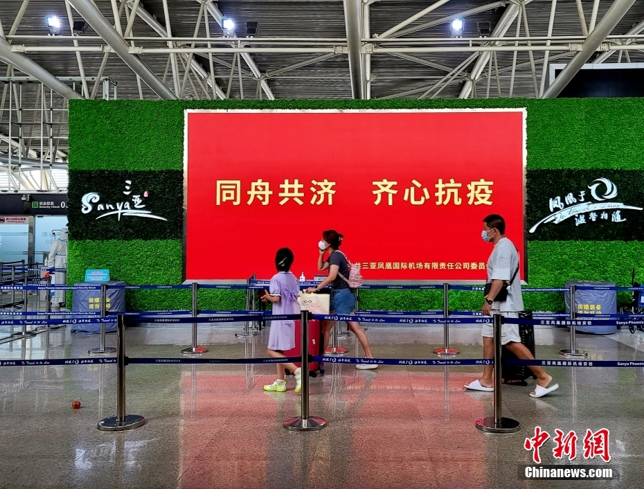 8月15日,三亚凤凰国际机场,旅客走过“同舟共济 齐心抗疫”标语。中新网