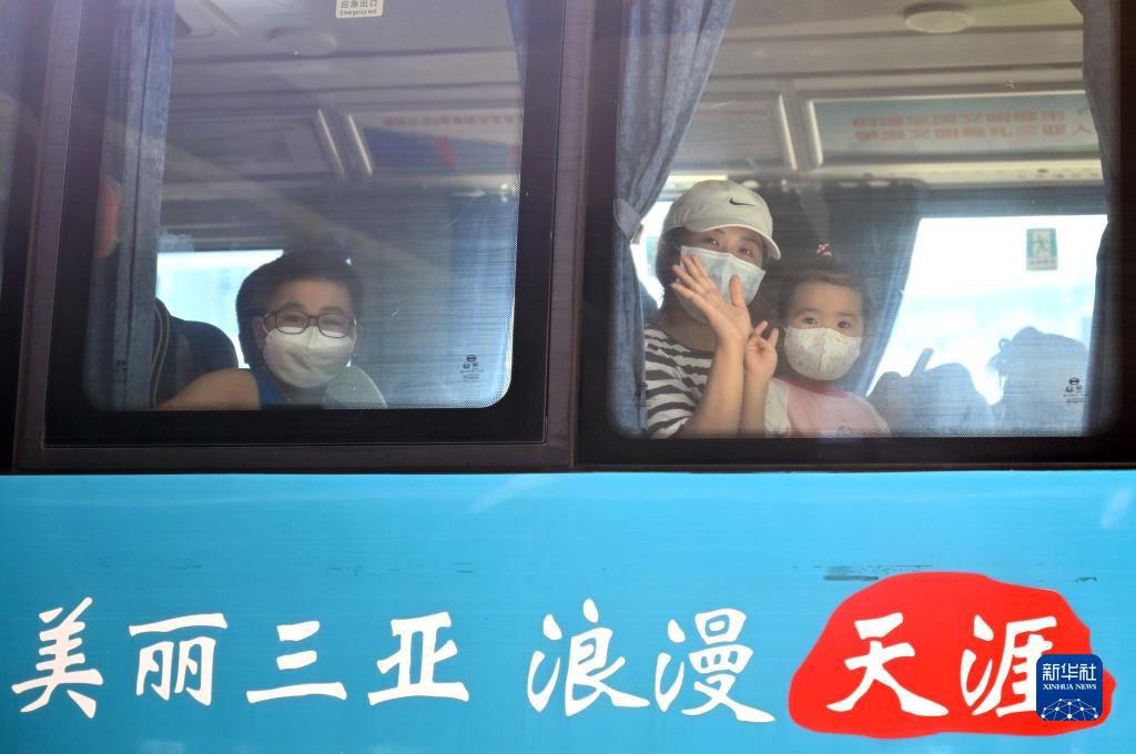 8月15日,旅客在三亚一家酒店门前乘坐免费大巴前往机场。新华网