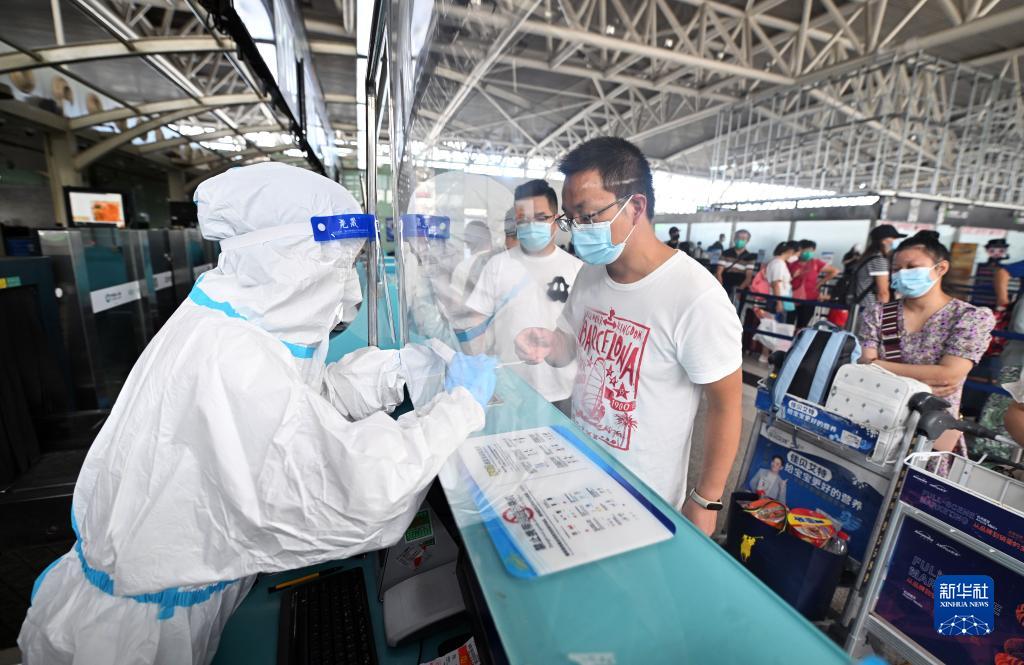 8月15日,旅客在三亚凤凰国际机场核验核酸检测阴性证明。新华网