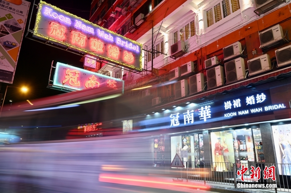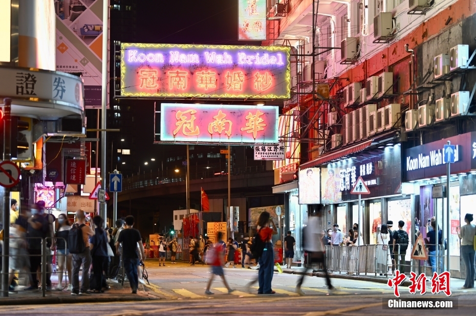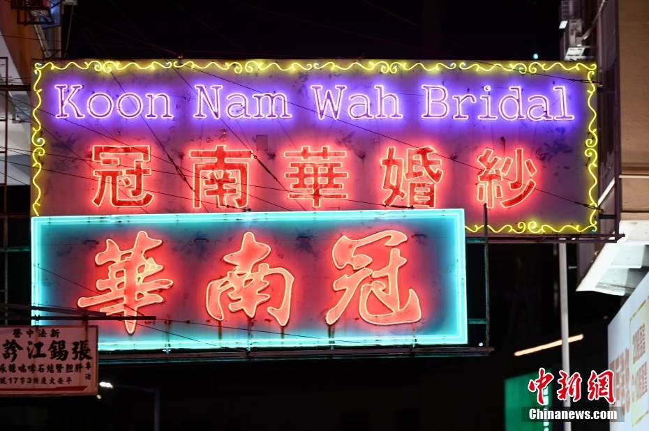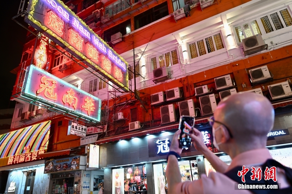 香港油麻地冠南华霓虹招牌清拆在即,市民8月16日晚上到油麻地冠南华店铺前拍摄霓虹招牌留念。冠南华于香港经营挂裙业务超过60年,特区政府立法规管招牌安全,旧式不合规格的霓虹招牌须清拆。