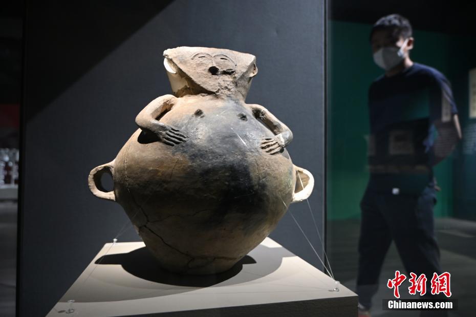 市民观赏出土于内蒙古通辽市南宝力皋吐墓地的新石器时代“人形陶壶”。中新网