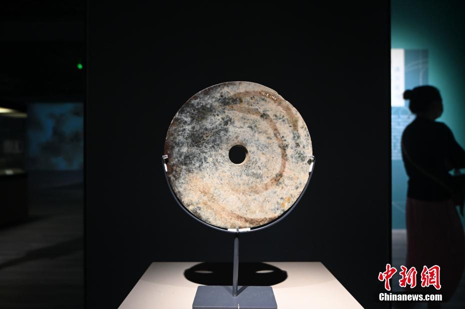 采集于浙江省杭州市余杭区仓前镇朱庙村的新石器时代刻符玉璧在展览中展出。中新网