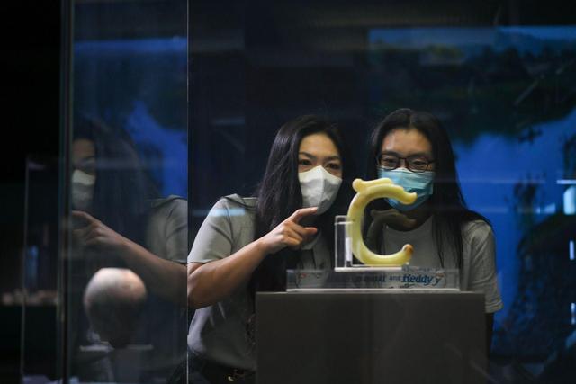 一名儿童观赏出土于内蒙古赤峰市翁牛特旗乌丹镇新地村的新石器时代“C”形黄玉龙。中新网