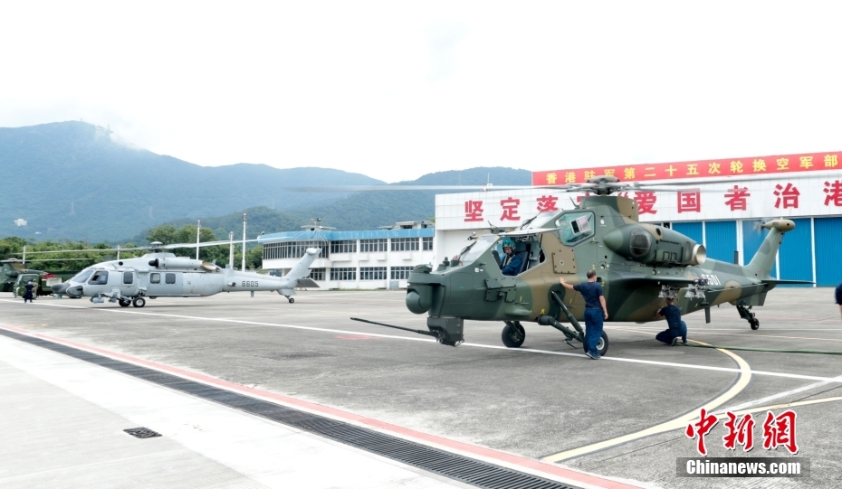 空军部队抵达石岗军营,接替轮换出港的直升机大队履行防务。中新网
