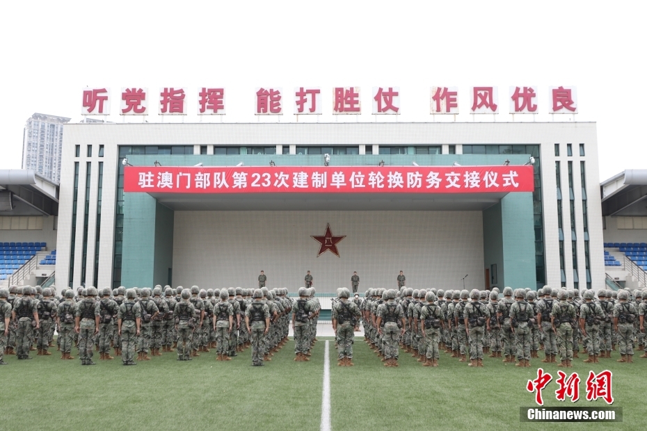 根据《中华人民共和国澳门特别行政区驻军法》和中央军委命令,中国人民解放军驻澳门部队于8月29日顺利完成进驻澳门以来第二十三次建制单位轮换。图为驻澳轮换部队组织防务交接仪式。中新网
