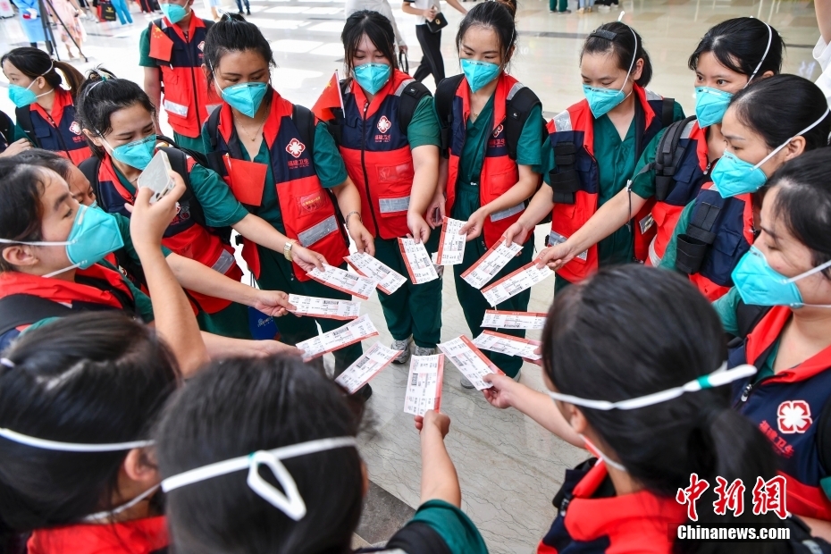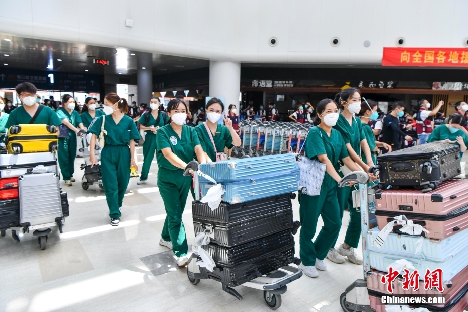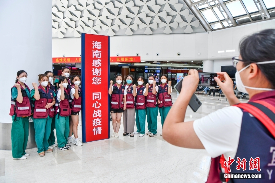 自8月初海南出现本轮疫情以来,中国20个省区市超2万余名医护人员驰援海南。当前,海南疫情防控形势稳步向好,社会面感染者进一步减少。海南各地援琼医疗队员26日起陆续返程。8月29日,福建、四川、山东等多地援琼医疗队近7000名队员从海口返程。图为四川援琼医疗队队员在海口美兰国际机场T1航站楼内合影。中新网