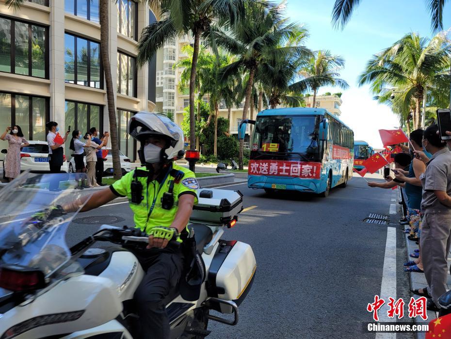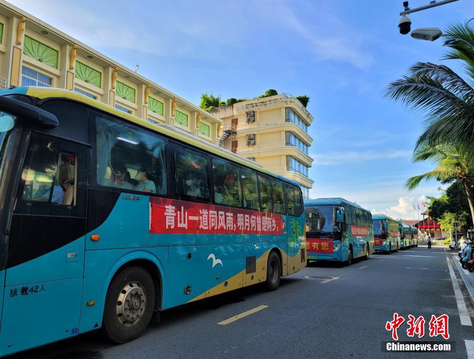 自8月初以来,上海、河南、浙江、江苏、湖南、湖北、陕西、安徽、江西、广东等10省市3431名医护人员驰援三亚,为三亚疫情防控做出重大贡献。图为8月29日,陕西援琼医疗队队员乘坐大巴准备前往机场。 中新网