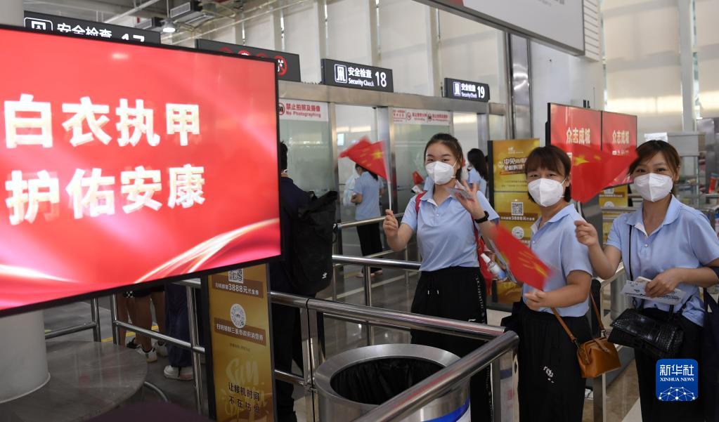 8月29日,在三亚凤凰国际机场,陕西省医疗队队员进入候机楼。新华网