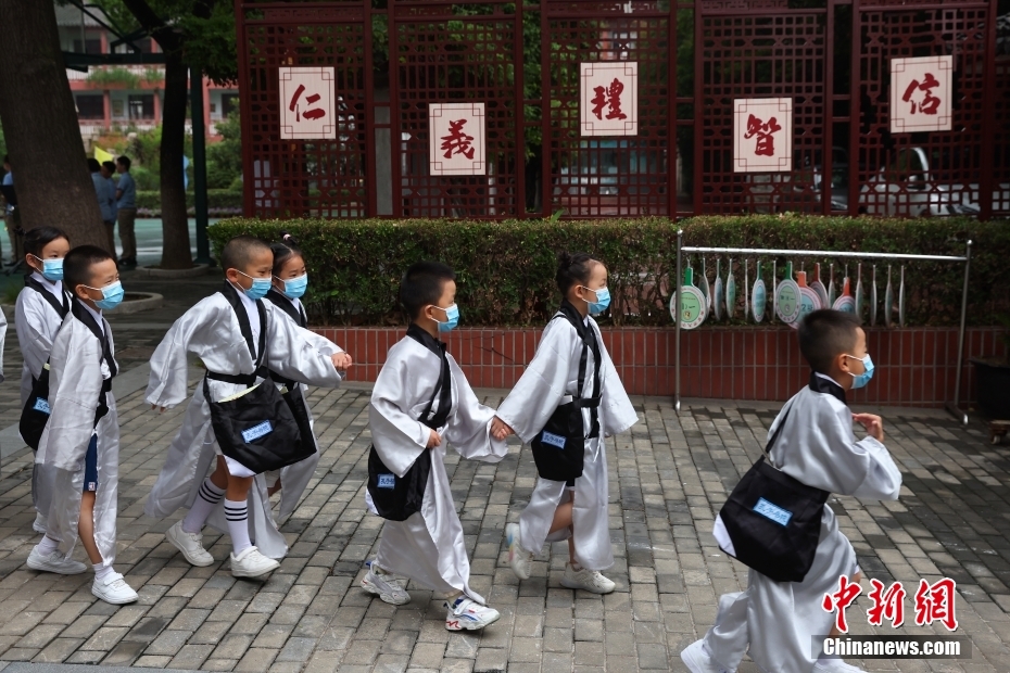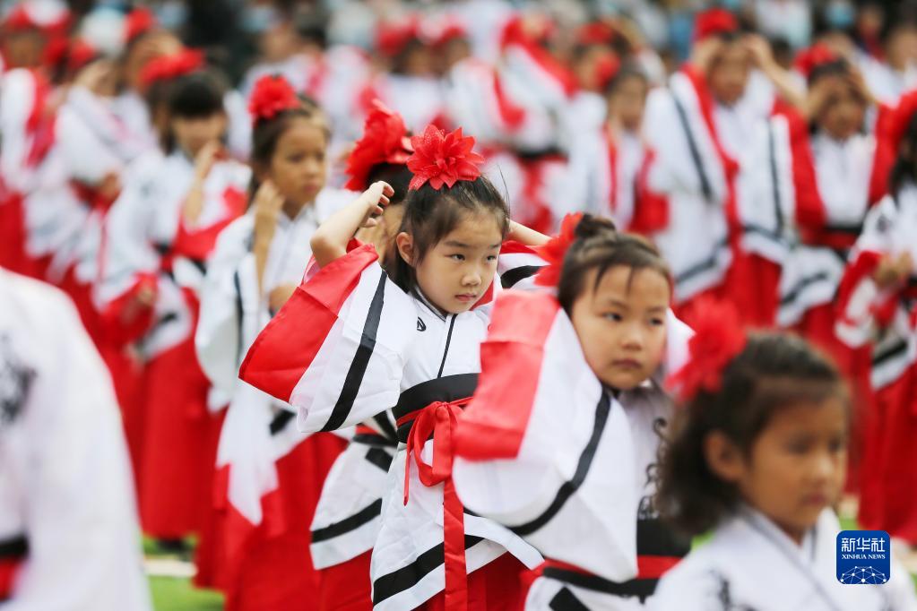 8月31日,安徽省淮北市黎苑路小学为一年级新生举办传统“开笔礼”仪式。200多名新生身着汉服参加“朱砂启智”“自正衣冠”“启蒙描红”“诵读经典”等活动,体验传统文化。图为8月31日,安徽省淮北市黎苑路小学一年级新生在“开笔礼”仪式上“自正衣冠”。新华网