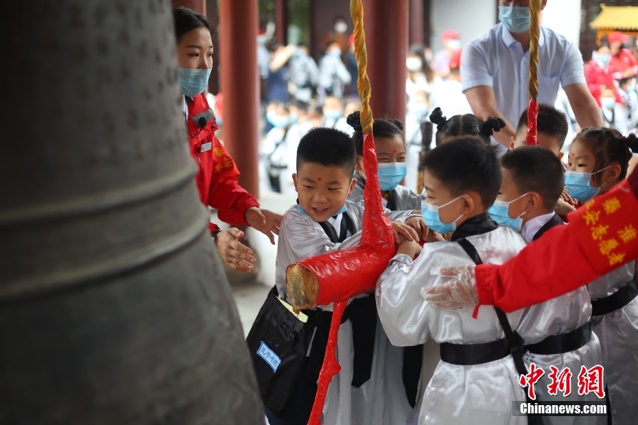 孩子们在夫子庙内敲响大钟。中新网