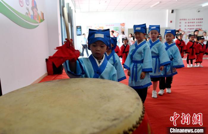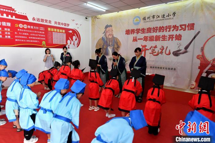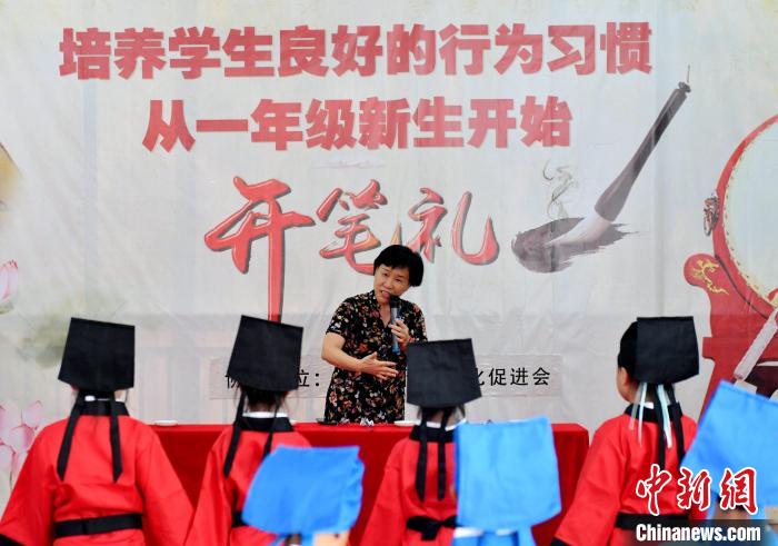 8月31日,福州市江边小学举行新生“开笔礼”仪式,通过正衣冠、共拜先师、朱砂启智、击鼓明志等传统仪式,激励同学们珍惜读书机会、勤奋学习,同时弘扬中国优秀的传统文化。图为福州市闽都乡学讲习中心主要负责人方向红老师为学生讲述开笔礼的传统。中新网