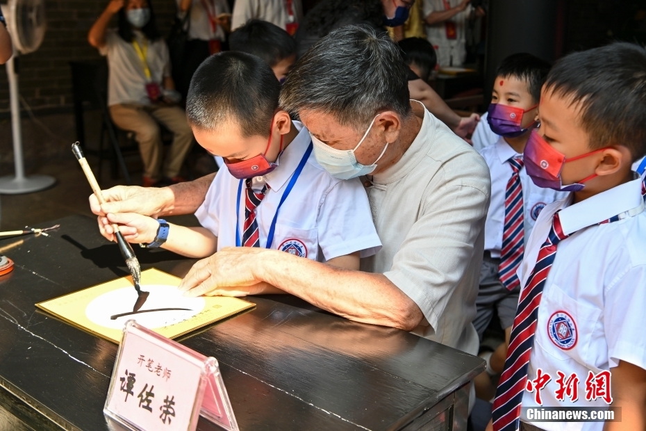 8月31日,广东省广州市,老师指导学童用毛笔书写“人”字。中新网