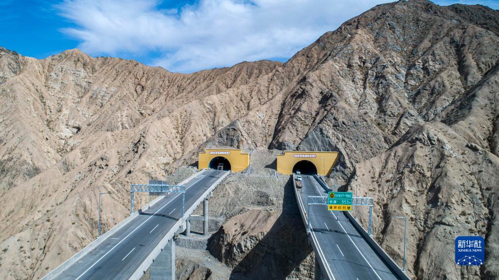 项目建成通车将进一步完善新疆路网结构,助推新疆特别是南疆地区经济社会高质量发展。图为依若高速公路巴什库尔干一号隧道(6月11日摄,无人机照片)。新华网