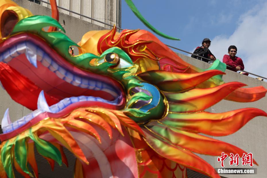 9月3日,游人在第三届多伦多龙文化节活动现场被巨型龙灯所吸引。