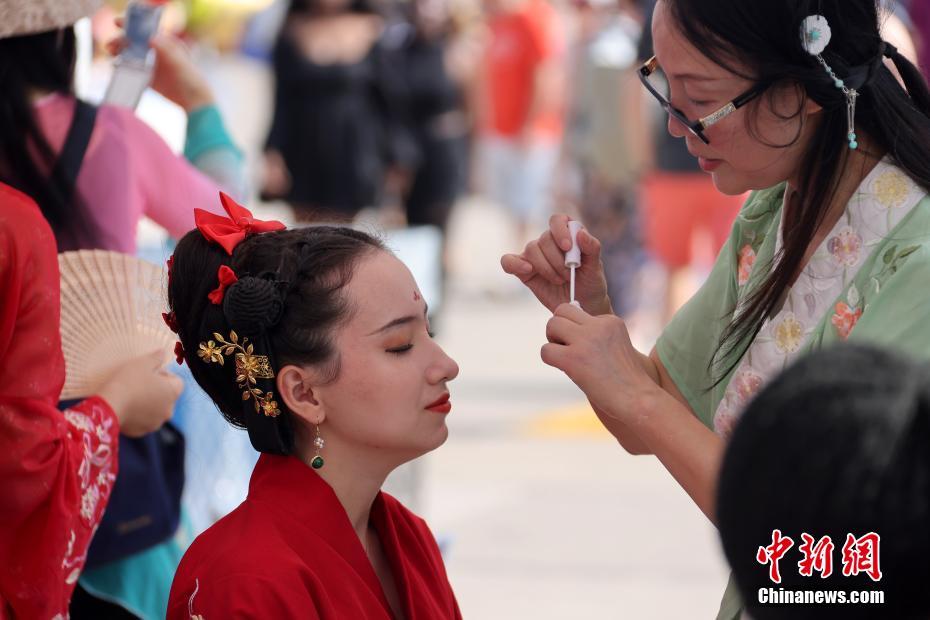 9月3日,在加拿大多伦多市中心举行的第三届多伦多龙文化节活动现场,文化展位工作人员正为一位年轻女子描画古典中国风的妆容。