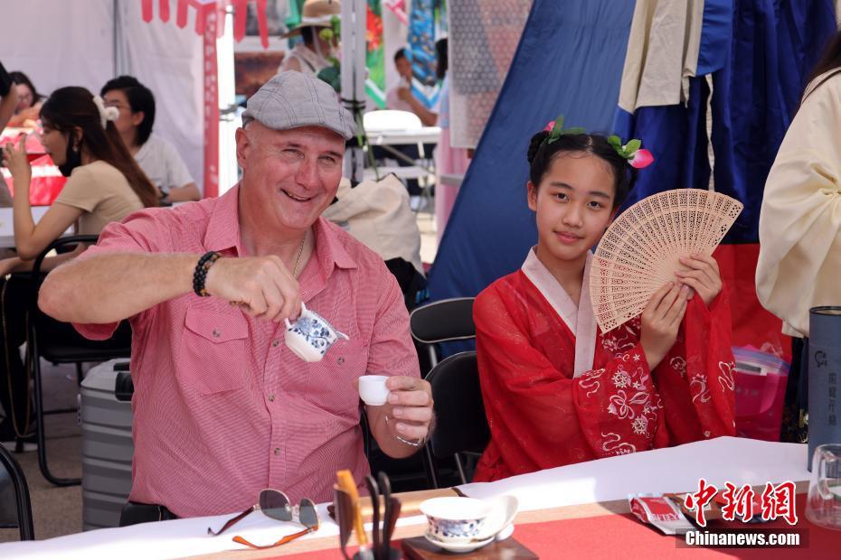 9月3日,游人在第三届多伦多龙文化节活动现场品茗中国茶。