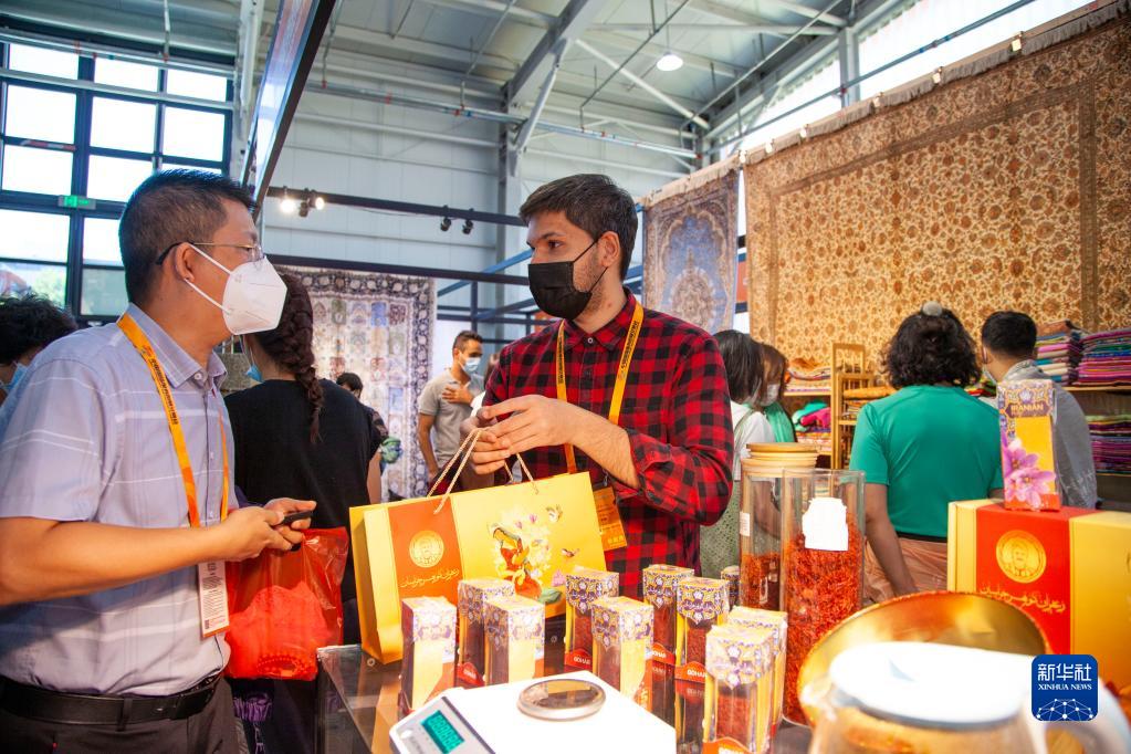 9月5日,观众(左)在服贸会首钢园区文旅服务专题展区伊朗展台购买商品。新华网
