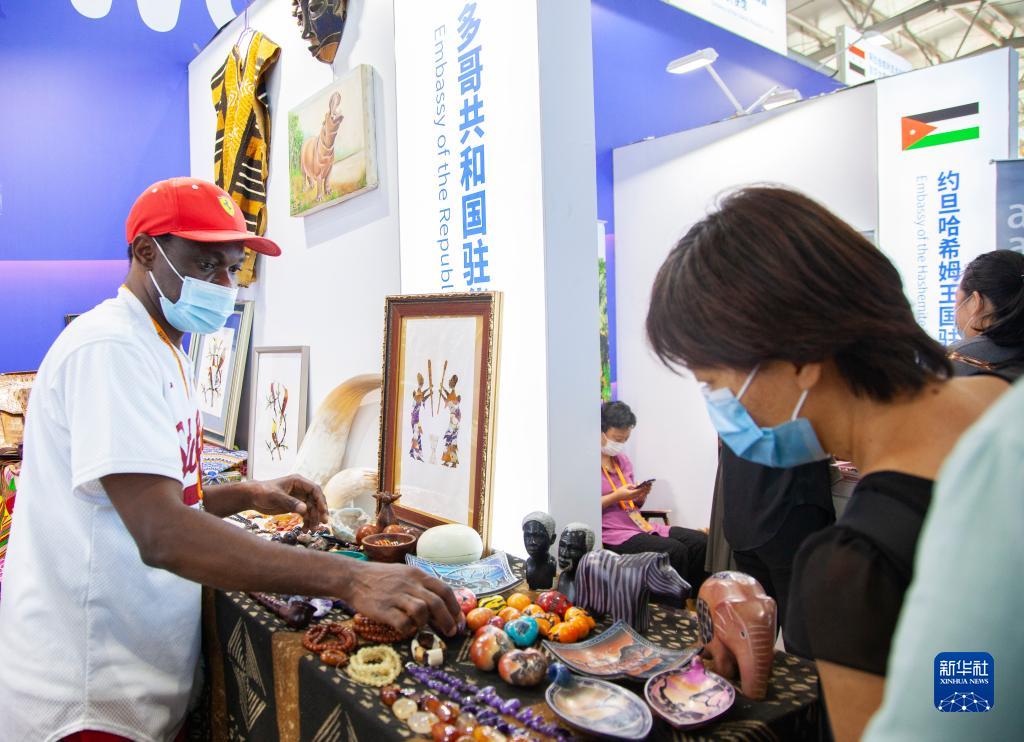 9月5日,观众在服贸会首钢园区文旅服务专题展区多哥展台挑选商品。新华网