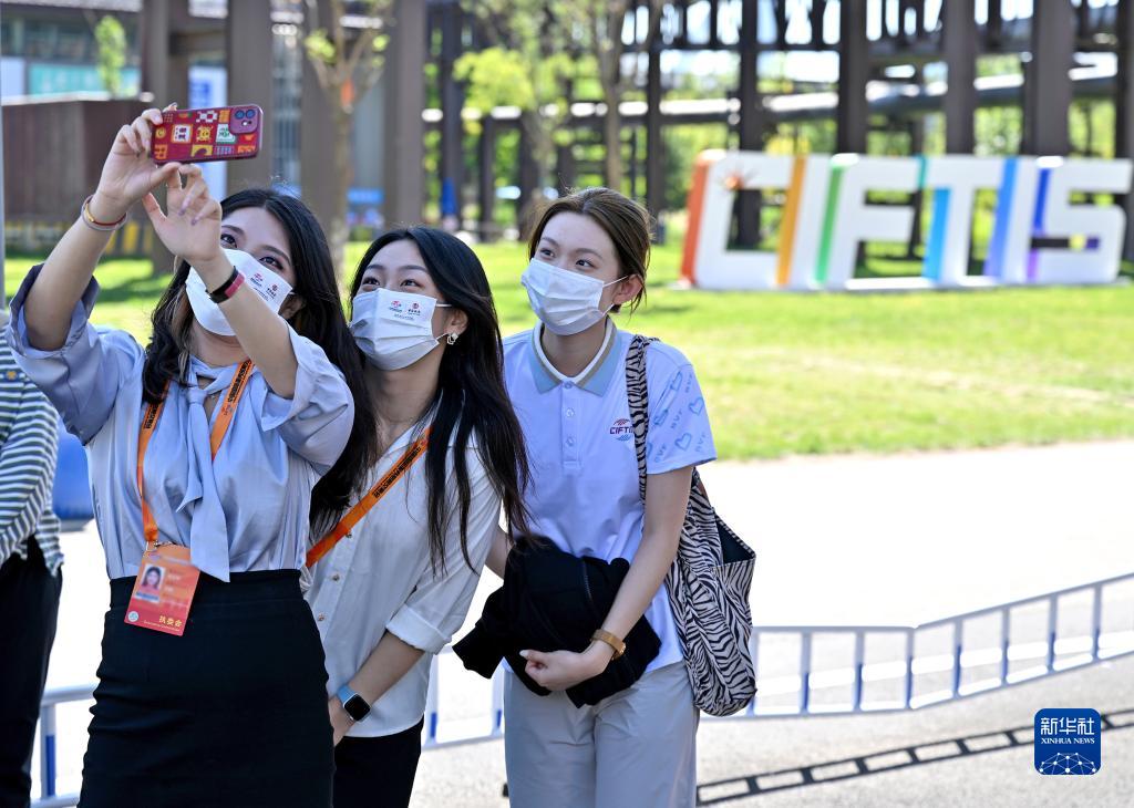 9月5日,工作人员和志愿者在服贸会首钢园区内拍照留念。新华网