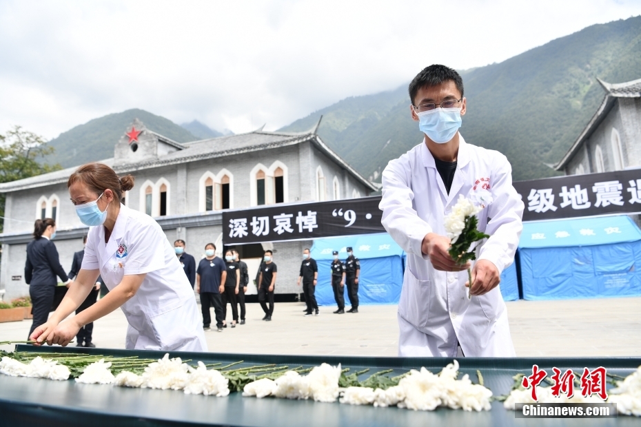 9月12日,医务工作者在磨西镇哀悼活动现场献花。中新网