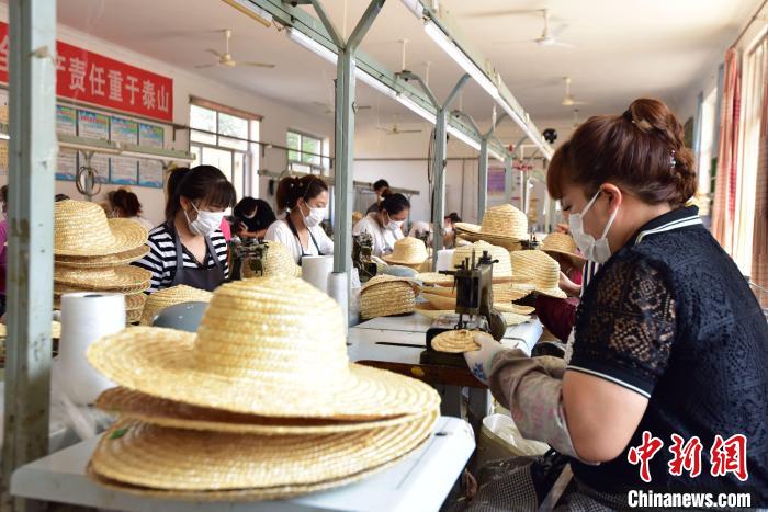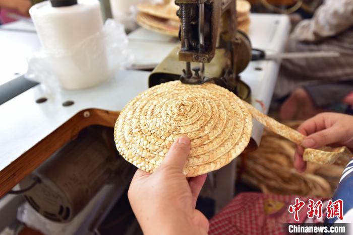 青县一家草编工艺品生产企业内,员工为草帽安装绑带。