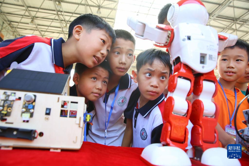 9月15日,2022年中国科普日活动在中国多地启动,活动将持续至9月21日。图为9月15日,在湖南省邵阳市隆回县思源实验学校举行的科普日宣传活动现场,学生们观看机器人表演。新华社