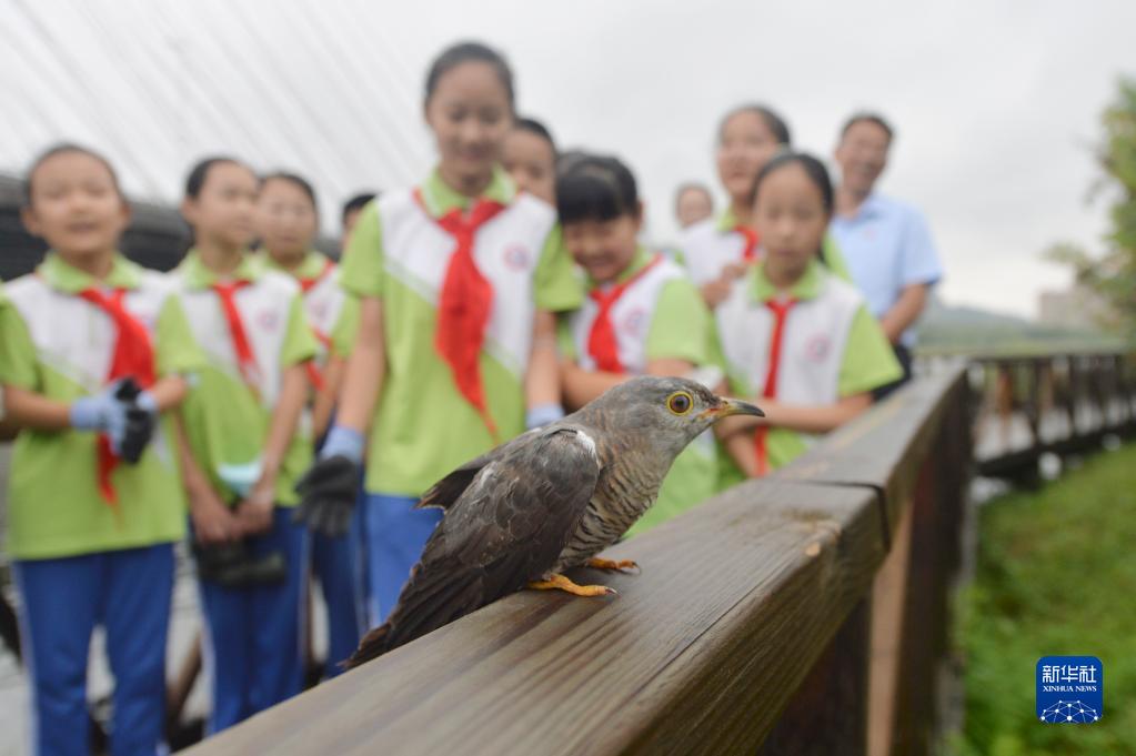 9月15日,在山东省青岛市城阳区丹山小学科普日活动上,一只放归的杜鹃准备起飞。新华社