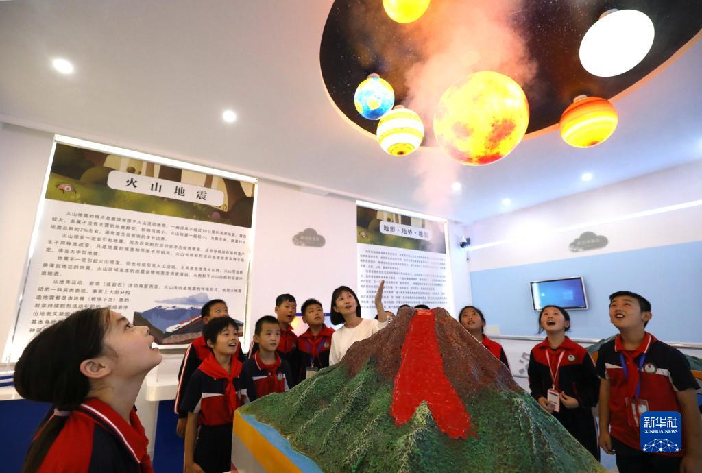9月15日,孩子们在山东省临沂市沂南县湖头镇双河村科技馆观看“火山喷发”模拟实验。新华社
