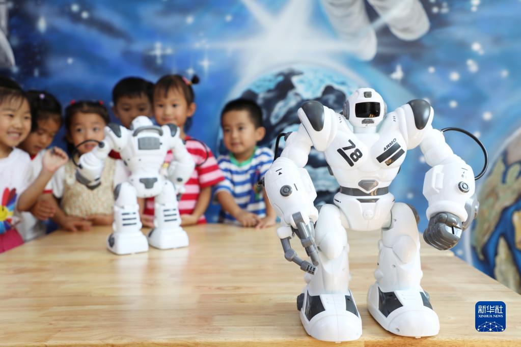 9月15日,河北省唐山市丰润区一幼儿园的小朋友在观看机器人表演。新华社