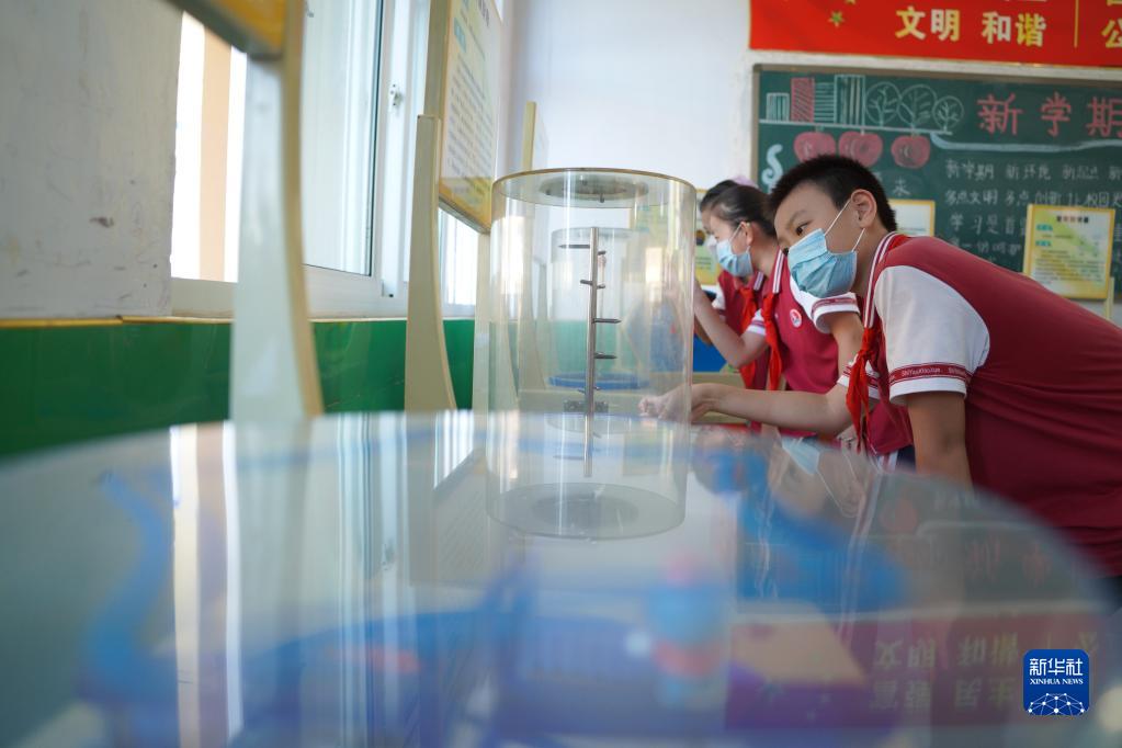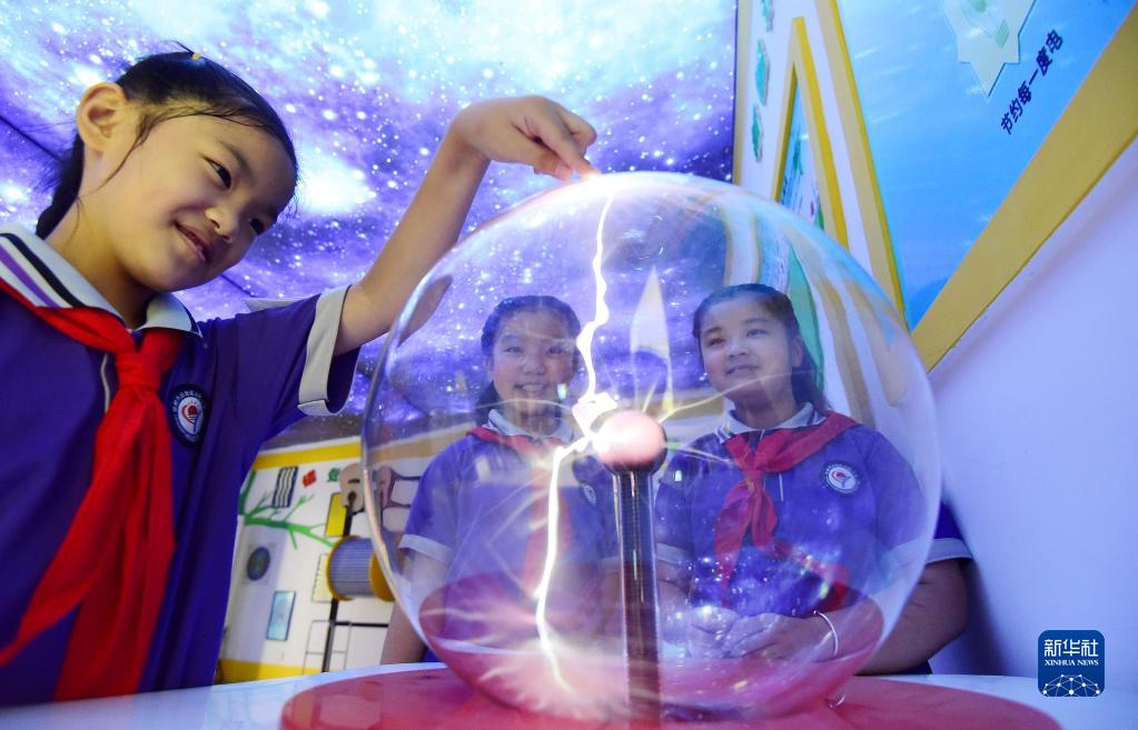 9月16日,河北省邯郸市丛台区丛阳小学的学生在校园科技馆体验“辉光球”。