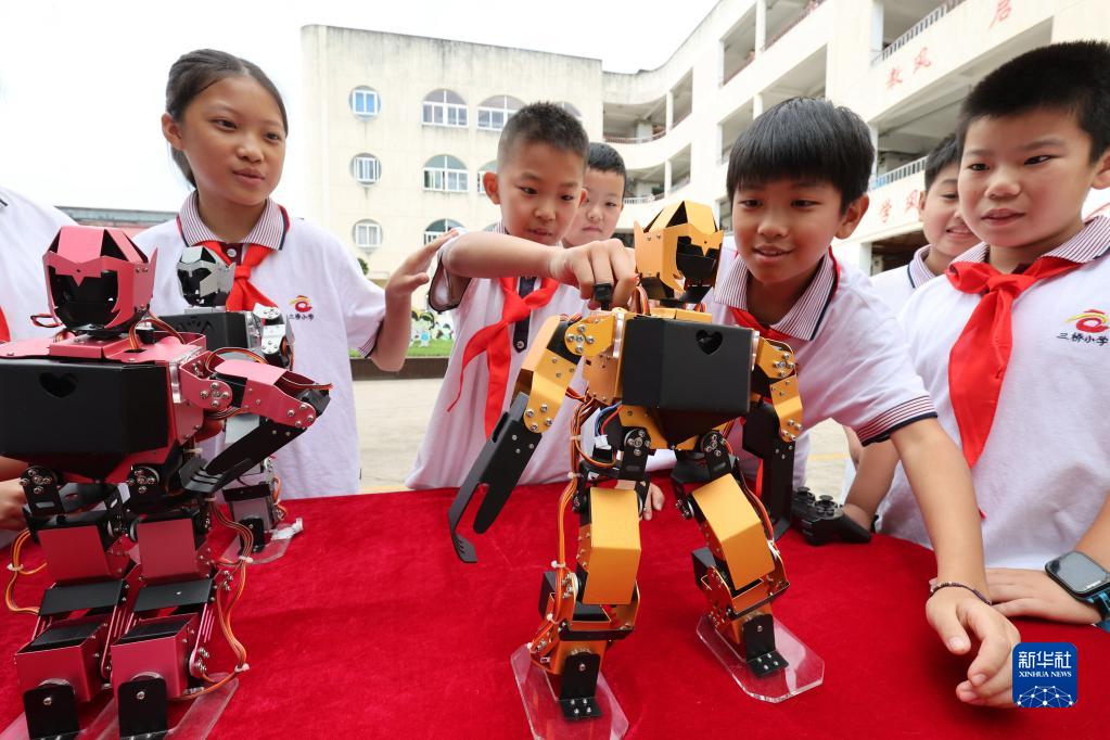 9月16日,浙江省湖州市德清县三桥小学学生与智能机器人互动。