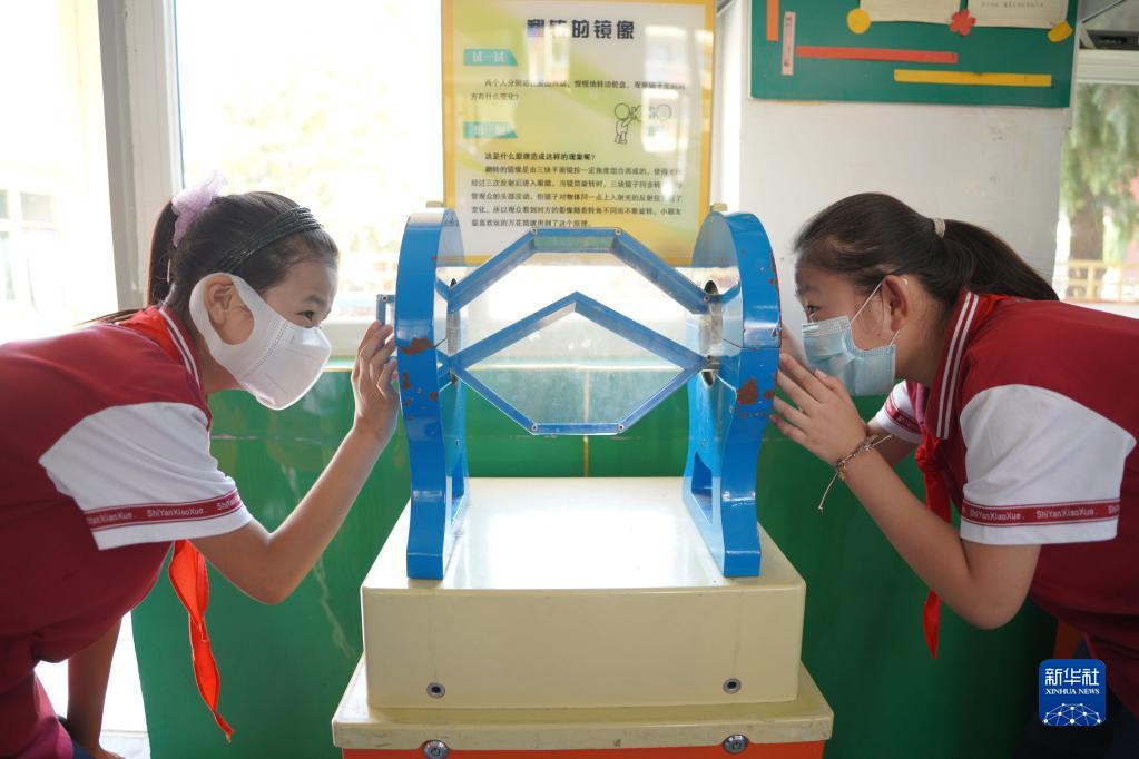 9月16日,河北省邢台市内丘县实验小学学生在科技大篷车巡展活动中体验“翻转的镜像”。
