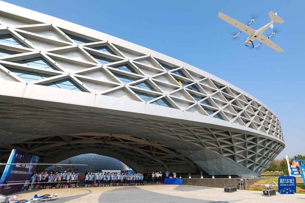 9月16日,在湖北省襄阳市科技馆,工作人员为学生演示无人机飞行技巧。