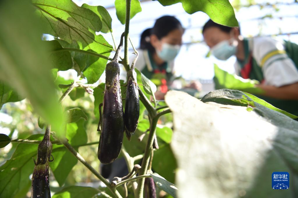 9月16日,在河北省石家庄市井陉孙庄育才学校“太空种子培育基地”,学生观察航茄生长情况。