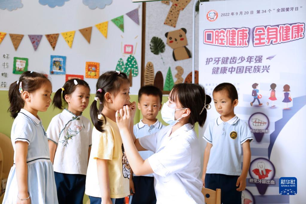9月20日是第34个“中国爱牙日”。统计显示,中国90%以上的成年人有不同程度的牙周病,66%的儿童患有龋齿。当天中国多地开展教育宣传活动,讲解护牙知识,倡导人们养成爱牙护牙的好习惯。图为9月19日,河北省邢台市南和区人民医院医务人员在为小朋友检查口腔健康状况。新华社