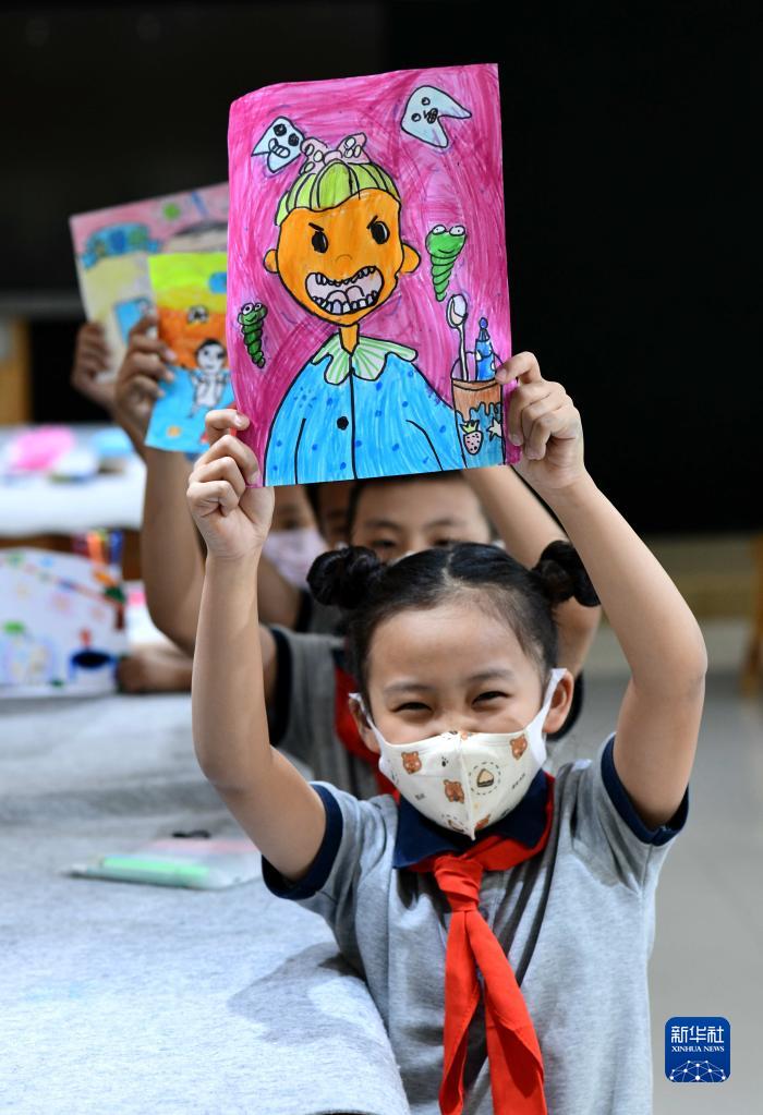 9月19日,在河北省石家庄市西古城小学,孩子们在展示迎接爱牙日主题绘画作品。新华社